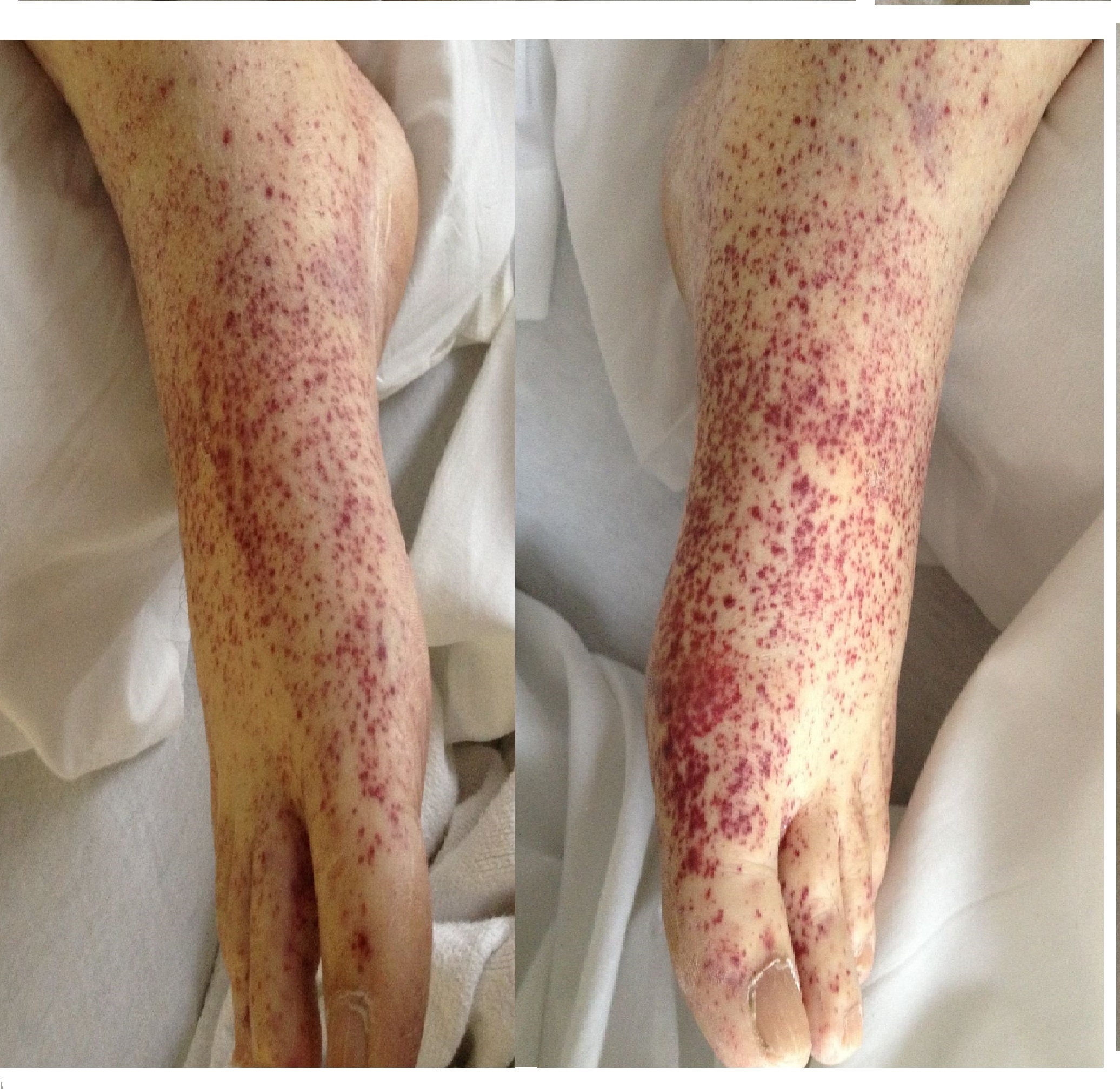 Rarely, patients have the appearance of purpura fulminans and frank necrosis or skin infarct purpura skin. Purpura are nonblanchable, hemorrhagic skin lesions that result from the leakage of red blood cells into the skin.